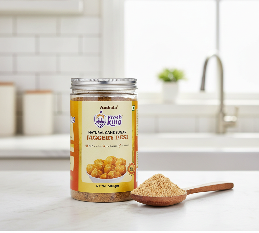 Step back into the rustic charm of rural Punjab with Ambala Pessi Gur. This premium, unrefined jaggery is crafted using age-old techniques, where fresh sugarcane juice is slow-cooked in large open vats to preserve its natural nutrients and deep, earthy flavor.