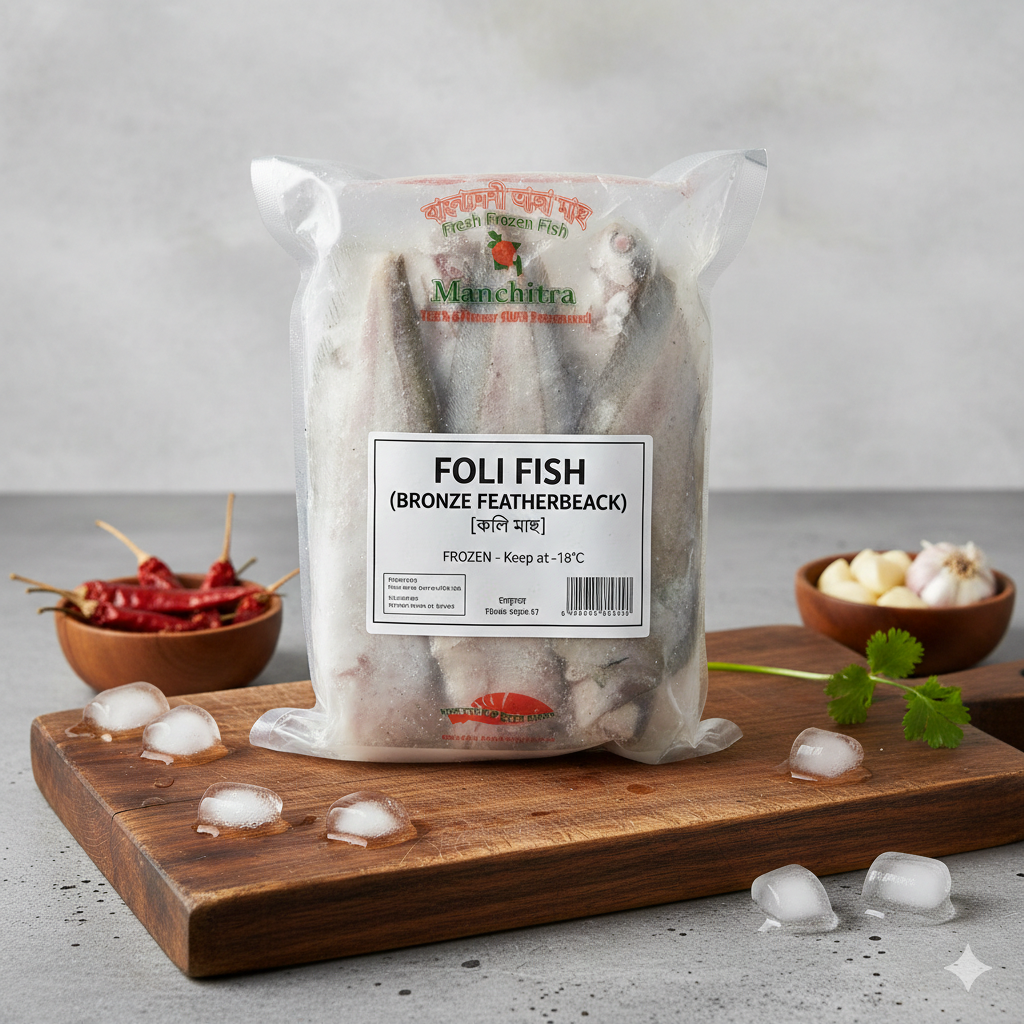 The Foli is a fascinating freshwater fish native to the rivers and wetlands of Bangladesh and India. Often called the "Bronze Featherback," it belongs to the same family as the prestigious Chital fish. While smaller and more affordable than the Chital, the Foli is highly prized for its sweet, delicate meat and its specific role in traditional "Muitha" (fish ball) recipes.